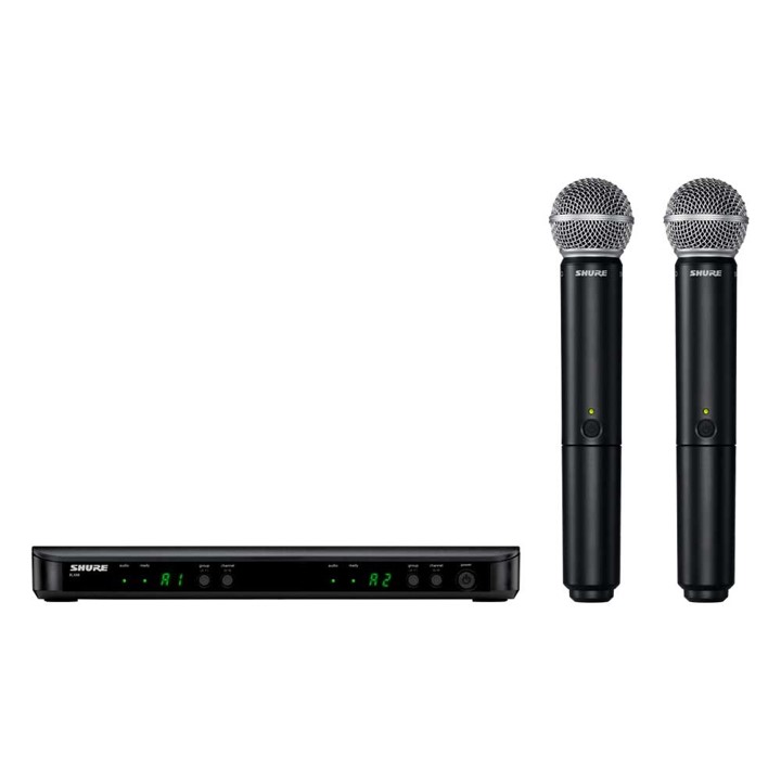 Combo inalámbrico de 2 transmisores de mano con cápsula PG58. El micrófono vocal inalámbrico más asequible de Shure para mejorar la calidad de sonido, que combina un ajuste sencillo y una interfaz intuitiva para ofrecer un funcionamiento fiable.